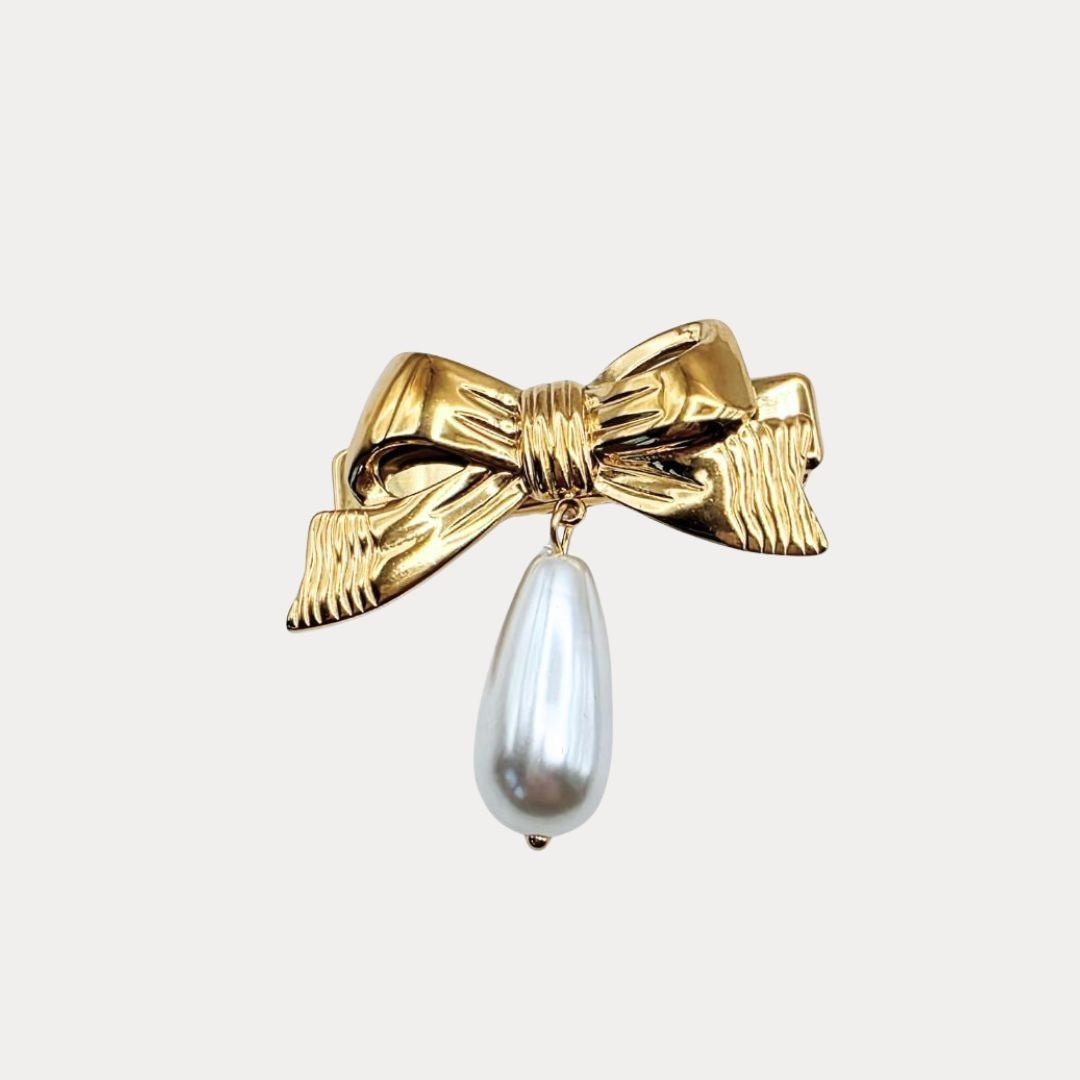 This exquisite gold bow hair clip features a delicate design that elegantly intertwines sophistication and charm. Embellished with a sparkling pearl at the center, the brooch catches the light beautifully, making it a perfect accessory for both formal and casual outfits. Crafted with attention to detail, this piece is ideal for adding a touch of elegance to any hairstyle or as a wonderful gift for a loved one.