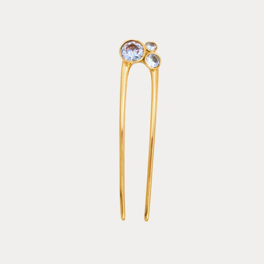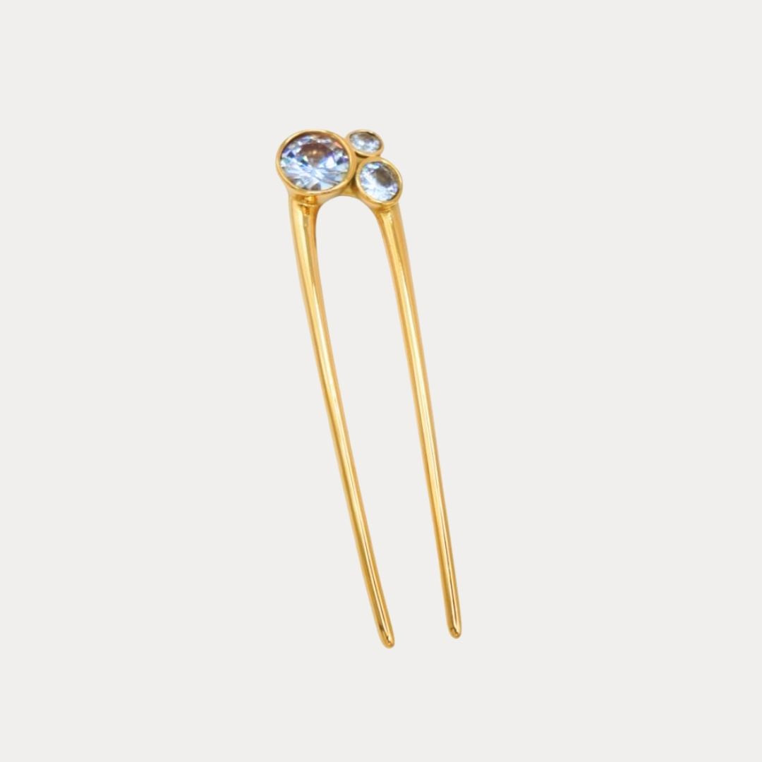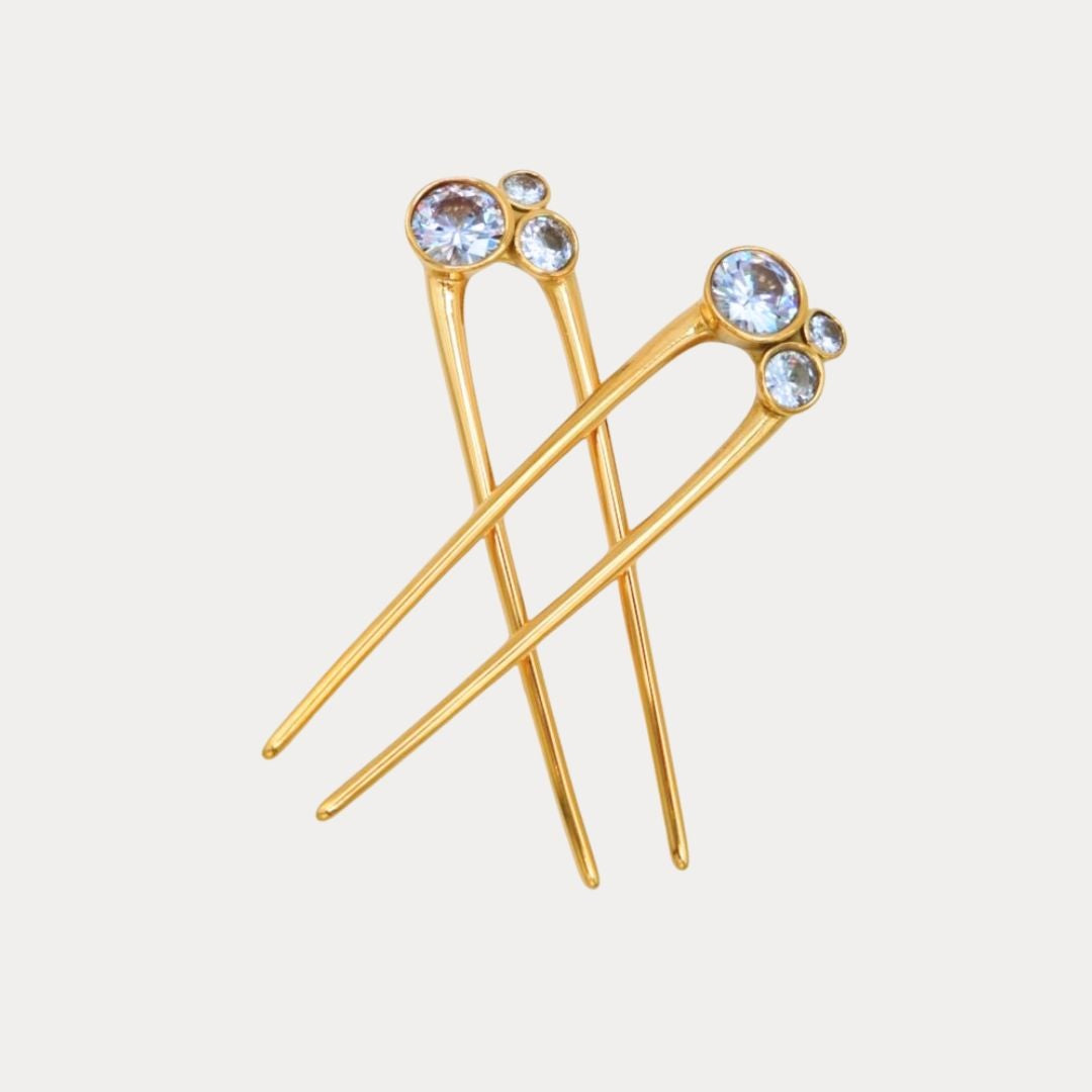 This exquisite gold hair pin features a stunning arrangement of zircon stones, adding a touch of elegance and sophistication to any hairstyle. Crafted with precision, the pin is designed to securely hold hair in place while enhancing your overall look. Ideal for both formal occasions and everyday wear, this accessory is a perfect blend of style and functionality.