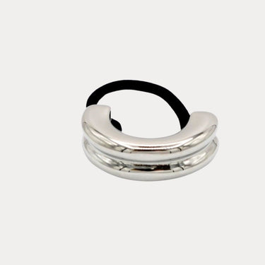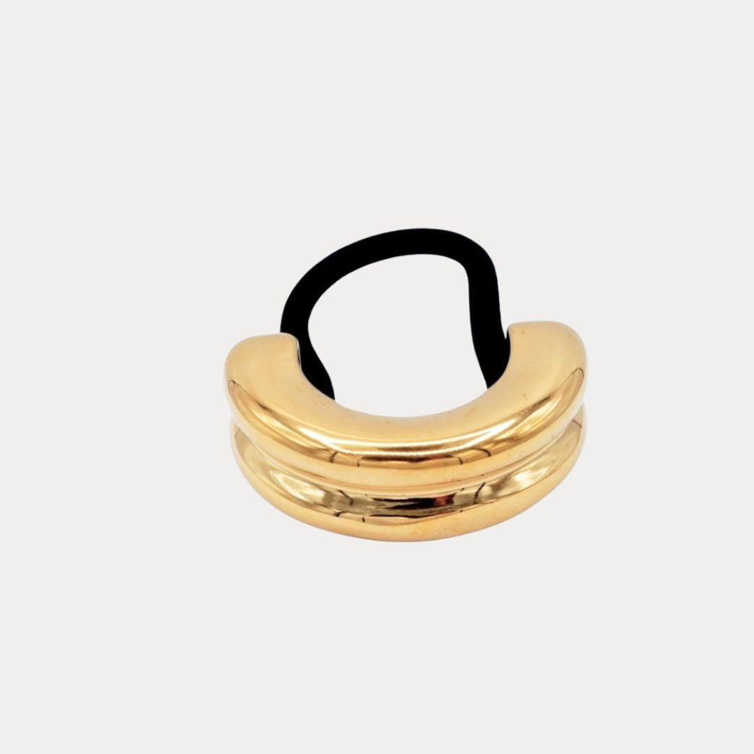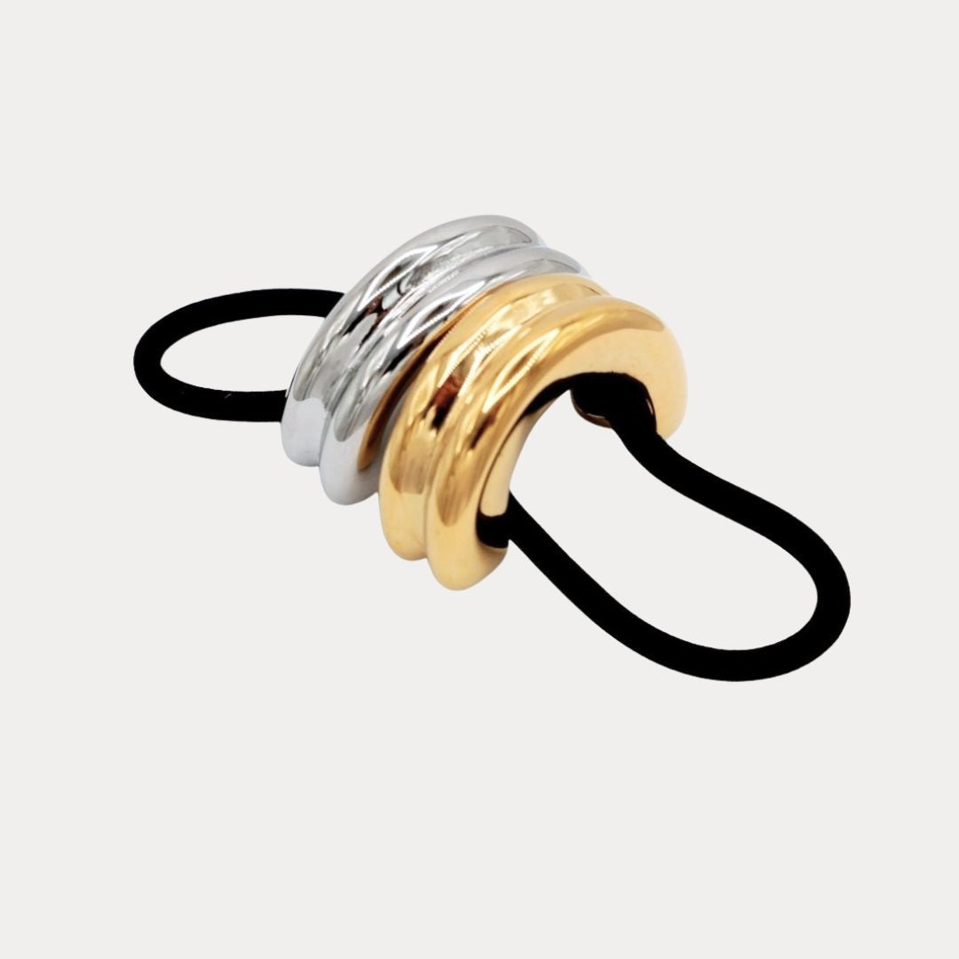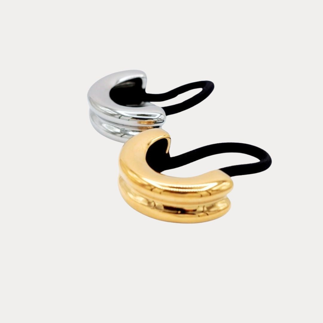 This exquisite gold Double Arch Rubber Band elegantly designed rings, complemented by stylish black hair ties. The rings showcase a modern aesthetic, making them perfect for both casual and formal occasions. The addition of the hair ties enhances their versatility, allowing for a chic and coordinated look. Ideal for those who appreciate a blend of sophistication and practicality, this set is a must-have accessory for any fashion-forward individual.
