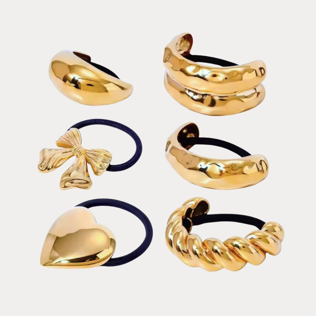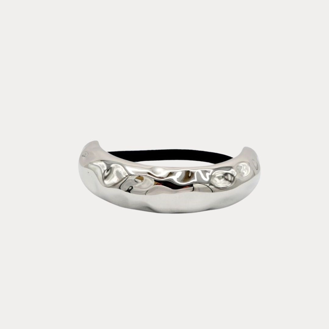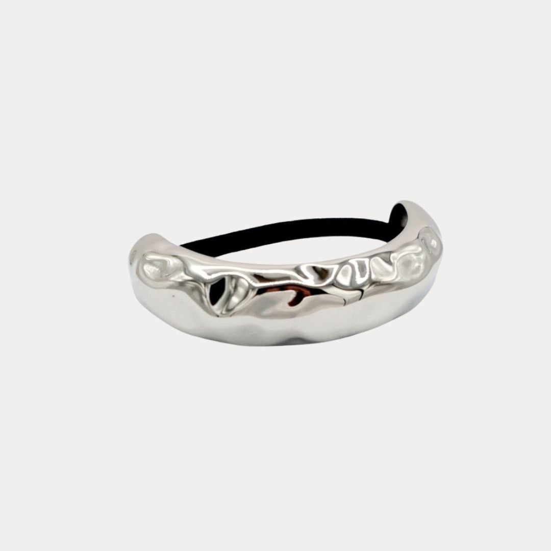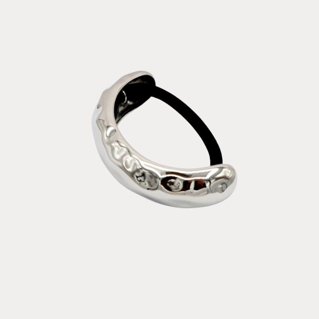 This elegant silver metal Hammered Texture Pony Cuff features a sleek design complemented by a contrasting black band, making it a versatile accessory for various occasions. Its lightweight construction ensures comfort, while the stylish combination of materials adds a modern touch to any outfit. Perfect for both casual and formal settings, this hair cuff is an ideal choice for those seeking a blend of sophistication and practicality.