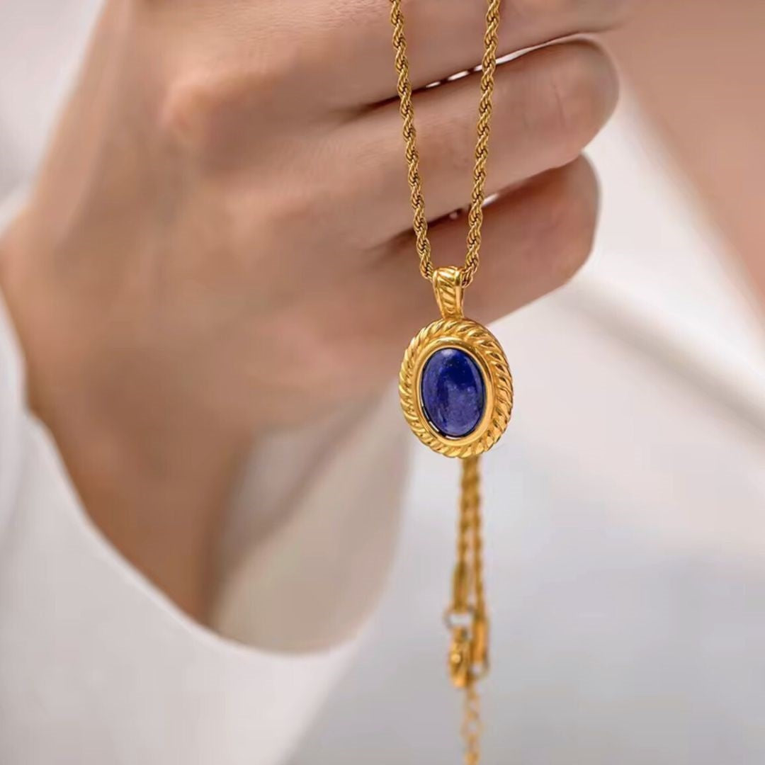 This exquisite gold chain necklace features a stunning blue stone pendant that adds a touch of elegance and sophistication. The rich gold hue beautifully complements the vibrant blue, making it a perfect accessory for both casual and formal occasions. Crafted with attention to detail, this necklace is designed to enhance any outfit while providing a timeless appeal.